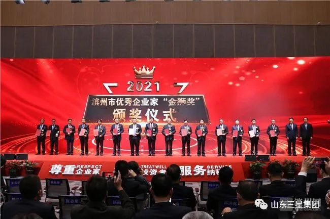 會議同時宣讀了《中共濱州市委、濱州市人民政府關于授予2021濱州市優(yōu)秀企業(yè)家“金獅獎”“銀獅獎”“銅獅獎”和富強濱州建設“金星獎”及公布濱州市“智能化綠色化技改十大優(yōu)秀案例”名單的決定》,隆重表彰優(yōu)秀企業(yè)家和獲獎單位,山東三星集團總經理王明星榮獲2021濱州市優(yōu)秀企業(yè)家“金獅獎”。