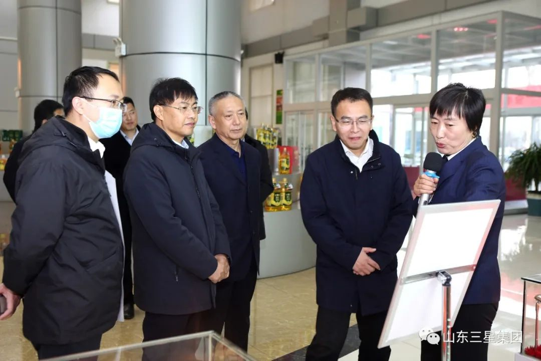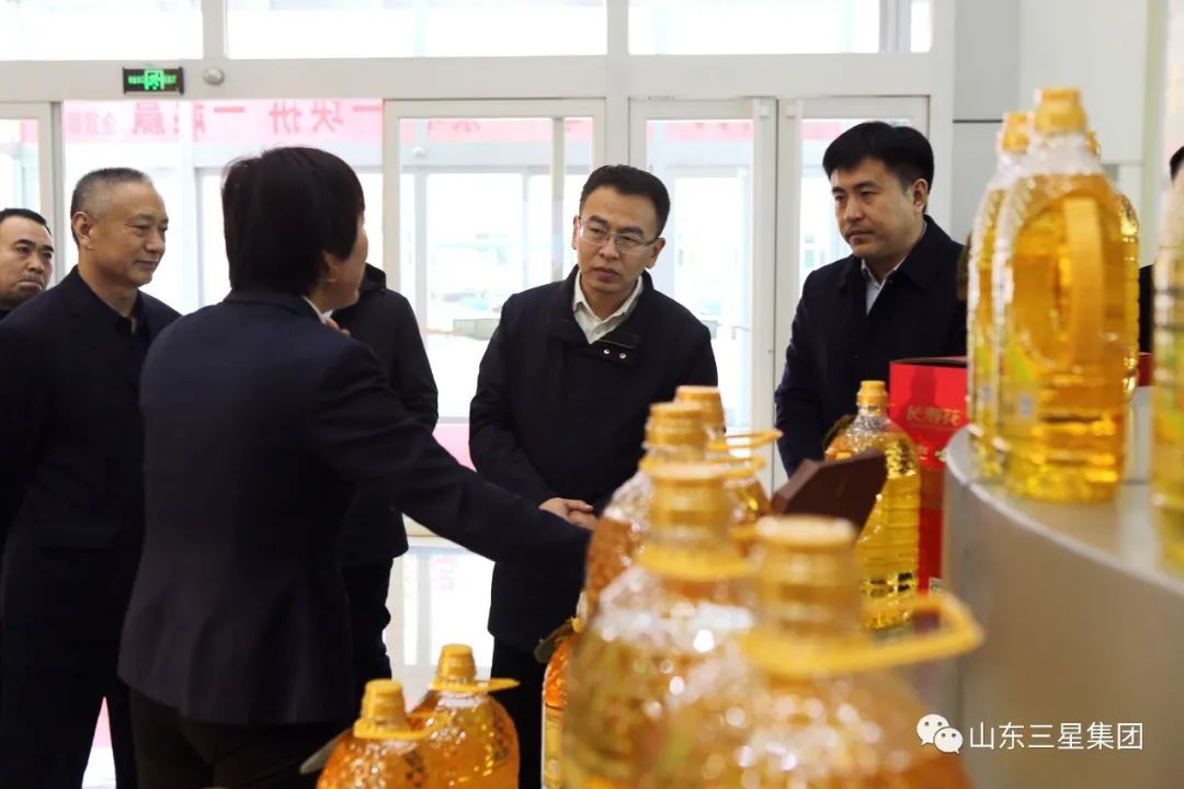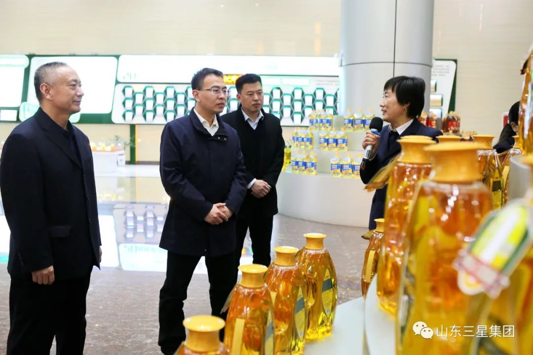王明峰對李群一行的到來表示歡迎,并分享了企業(yè)在推進玉米精深加工、延展高端糧油產(chǎn)業(yè)鏈條等領(lǐng)域的實踐經(jīng)驗和探索成果,就企業(yè)來年高端糧油產(chǎn)業(yè)發(fā)展規(guī)劃和戰(zhàn)略布局作詳細介紹。他表示,多年來,在各級黨委政府關(guān)心和支持下,山東三星集團搶抓機遇、主動作為,時刻不忘農(nóng)業(yè)產(chǎn)業(yè)化龍頭企業(yè)責(zé)任擔(dān)當(dāng),在高端糧油產(chǎn)業(yè)化創(chuàng)新、規(guī)范化生產(chǎn)、專業(yè)化運營等領(lǐng)域持續(xù)發(fā)力。自主創(chuàng)新研發(fā)了長壽花濃香玉米油、長壽花零反式脂肪高養(yǎng)玉米油等一系列新型高端食用油產(chǎn)品,上市箸下“本釀造”系列調(diào)味品,著力豐富國民餐桌,健康國民生活;加速構(gòu)建玉米油全產(chǎn)業(yè)鏈布局,全力提升農(nóng)業(yè)綜合生產(chǎn)能力,助力推動農(nóng)業(yè)增效農(nóng)民增收;并深度參與“齊魯糧油”公眾品牌建設(shè),強力拓展新型品牌營銷推廣渠道,致力打造核心競爭力更強、農(nóng)業(yè)產(chǎn)業(yè)化帶動效益更明顯的優(yōu)質(zhì)民族糧油品牌。王明峰還提到,新的一年,山東三星集團將立足自身稟賦優(yōu)勢,強化優(yōu)質(zhì)渠道拓展及品牌價值提升,在深度融入新發(fā)展格局過程中展現(xiàn)新作為,為建設(shè)現(xiàn)代化富強文明新鄒平,促進農(nóng)村經(jīng)濟高質(zhì)量發(fā)展貢獻新力量。