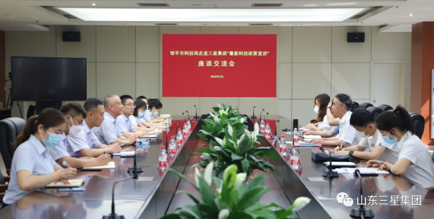 5月24日,鄒平市科學(xué)技術(shù)局二級(jí)主任科員郭樂山攜調(diào)研團(tuán)就企業(yè)科技創(chuàng)新情況來山東三星集團(tuán)調(diào)研座談。山東三星集團(tuán)黨總支書記、老董事長(zhǎng)王明峰,規(guī)劃發(fā)展部總監(jiān)陳劍飛等接待來訪領(lǐng)導(dǎo)一行。