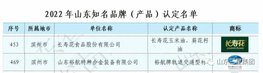 近日,2022年山東知名品牌認定名單發(fā)布,來自全省541家組織的502個產(chǎn)品、97個服務項目上榜,山東三星集團旗下長壽花玉米油、葵花籽油以及裕航合金軌道交通型材三個產(chǎn)品被認定為2022年山東知名品牌。
