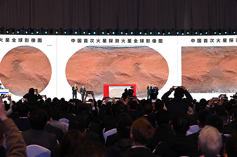 啟動儀式上,國家航天局、中國科學(xué)院聯(lián)合發(fā)布中國首次火星探測火星全球影像圖;深空探測全國重點實驗室及中國科學(xué)技術(shù)大學(xué)“深空探測學(xué)院”正式掛牌;鵲橋通導(dǎo)技術(shù)試驗星正式命名為“天都一號”“天都二號”。