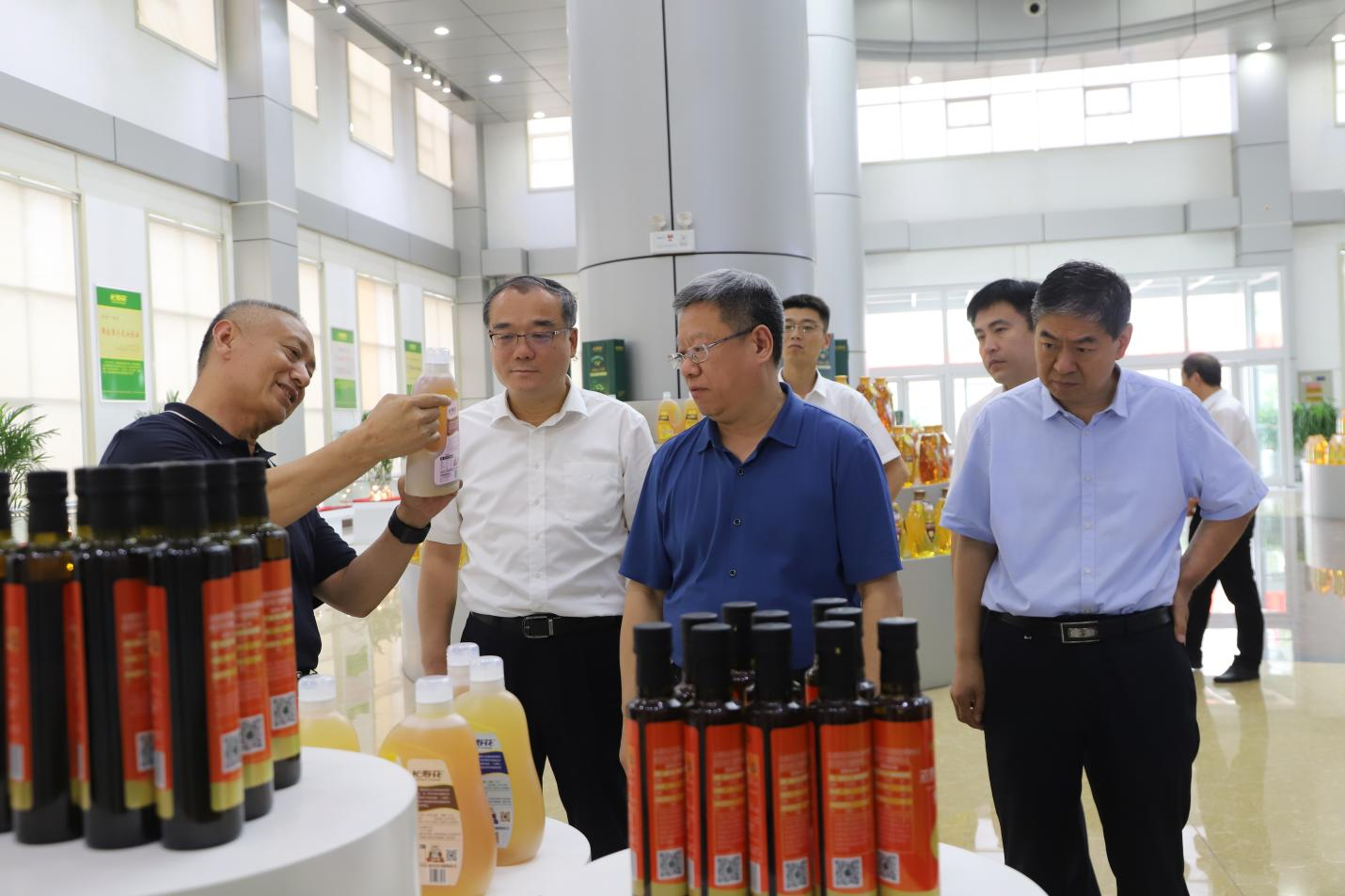 調(diào)研領(lǐng)導(dǎo)一行先后到長(zhǎng)壽花產(chǎn)品展廳、全自動(dòng)灌裝包裝生產(chǎn)車(chē)間實(shí)地參觀調(diào)研,現(xiàn)場(chǎng)聽(tīng)取了企業(yè)資源整合、產(chǎn)業(yè)布局規(guī)劃及創(chuàng)新成果轉(zhuǎn)化等相關(guān)工作情況介紹,并與王明峰進(jìn)行了深入交流。