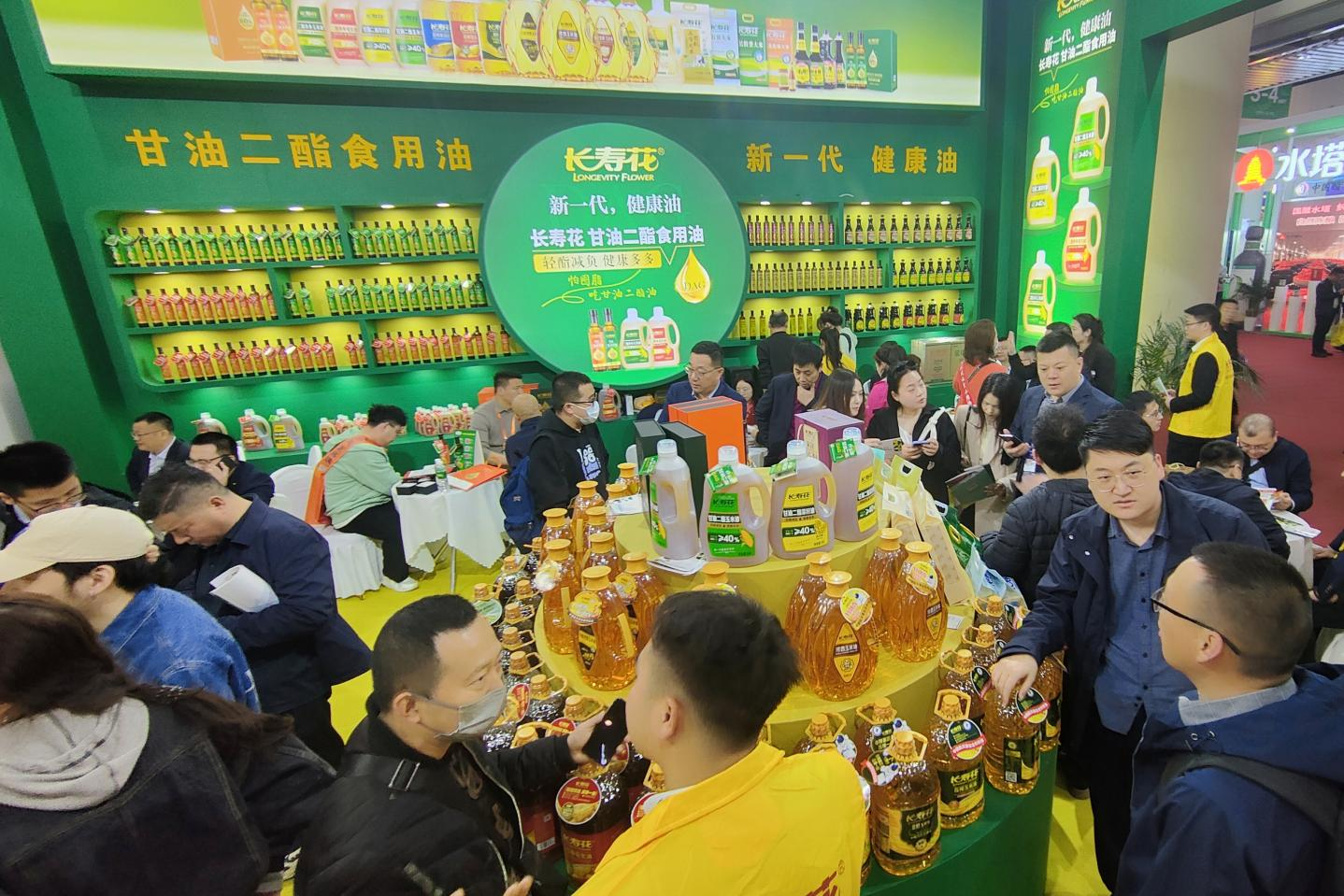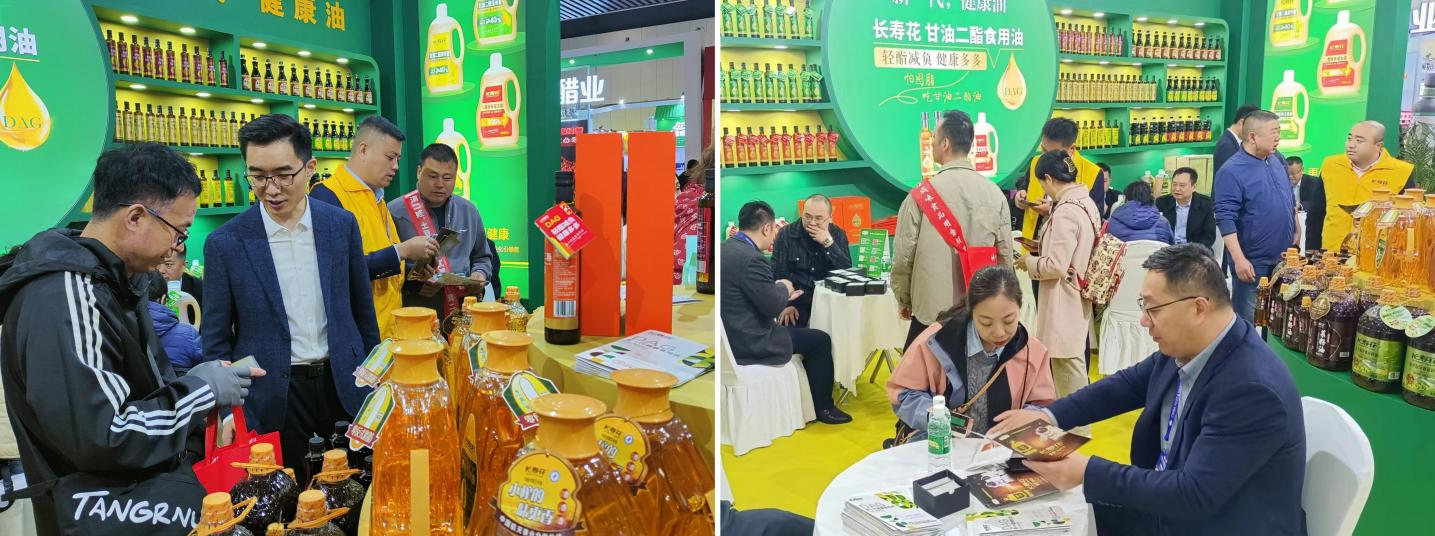 相約蓉城,花綻精彩。在長壽花食品特色展區(qū),全系產(chǎn)品展示、新品重磅亮相,加上全國區(qū)域市場主要負(fù)責(zé)人的現(xiàn)場互動宣講,吸引了眾多與會人員參與互動,展位前滿滿都是前來咨詢的客商。值得關(guān)注的是,伴隨著健康消費理念的升級,首次亮相糖酒會的長壽花甘油二酯(DAG含量20%—80%)系列食用油,憑借其輕酯特質(zhì)和健康屬性,以及在業(yè)內(nèi)的產(chǎn)業(yè)化引領(lǐng)作用,實力出圈,強勢吸粉,成為本屆展會最為閃耀的新品之一。