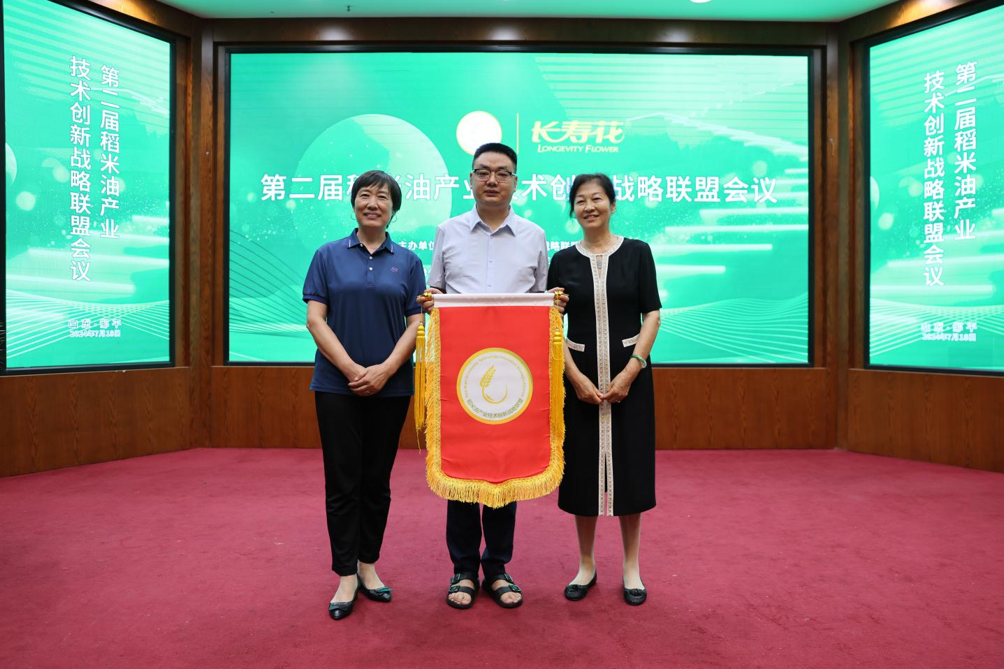 大會同時舉辦了第三屆稻米油產(chǎn)業(yè)技術(shù)創(chuàng)新戰(zhàn)略聯(lián)盟會議授旗儀式,張桂鳳及長壽花食品、第三屆聯(lián)盟會議承辦單位代表完成旗幟轉(zhuǎn)交,從山東到湖北,從黃河之濱到長江之畔,在場與會領(lǐng)導(dǎo)嘉賓共同見證了授旗使命的傳遞和接力。