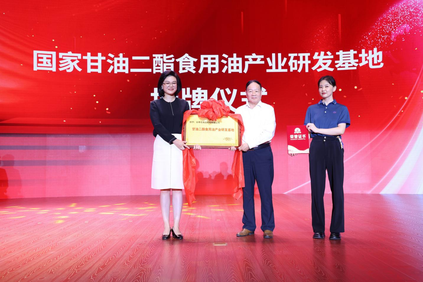 大會(huì)同期舉行了“國(guó)家甘油二酯食用油產(chǎn)業(yè)研發(fā)基地”授牌儀式。山東三星集團(tuán)董事長(zhǎng)、總裁王亞群從中國(guó)糧油學(xué)會(huì)油脂分會(huì)會(huì)長(zhǎng)何東平手中接過(guò)授牌,這也是繼“國(guó)家玉米油產(chǎn)業(yè)研發(fā)基地”后,長(zhǎng)壽花獲得的又一國(guó)字號(hào)“產(chǎn)業(yè)研發(fā)基地”金字招牌。