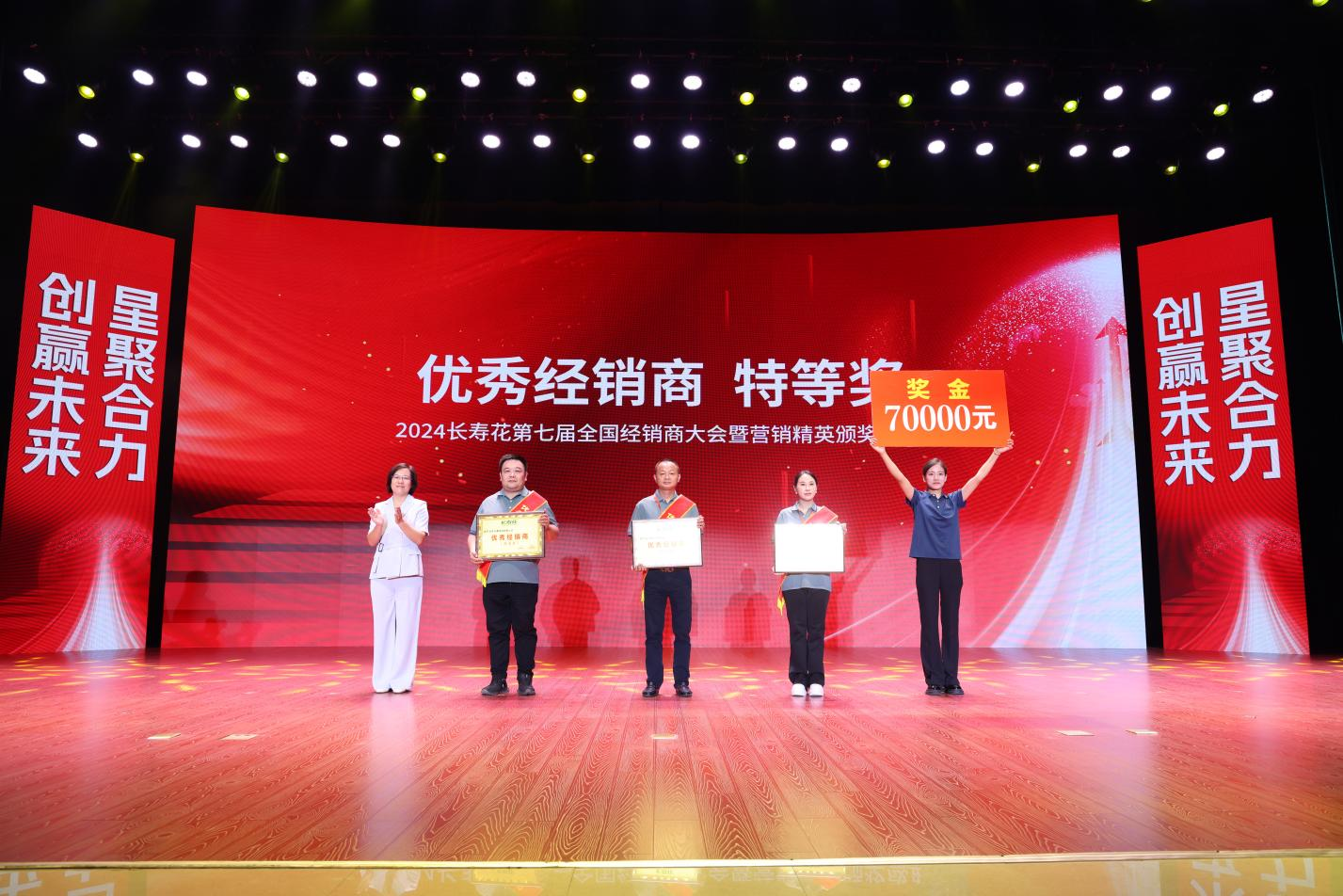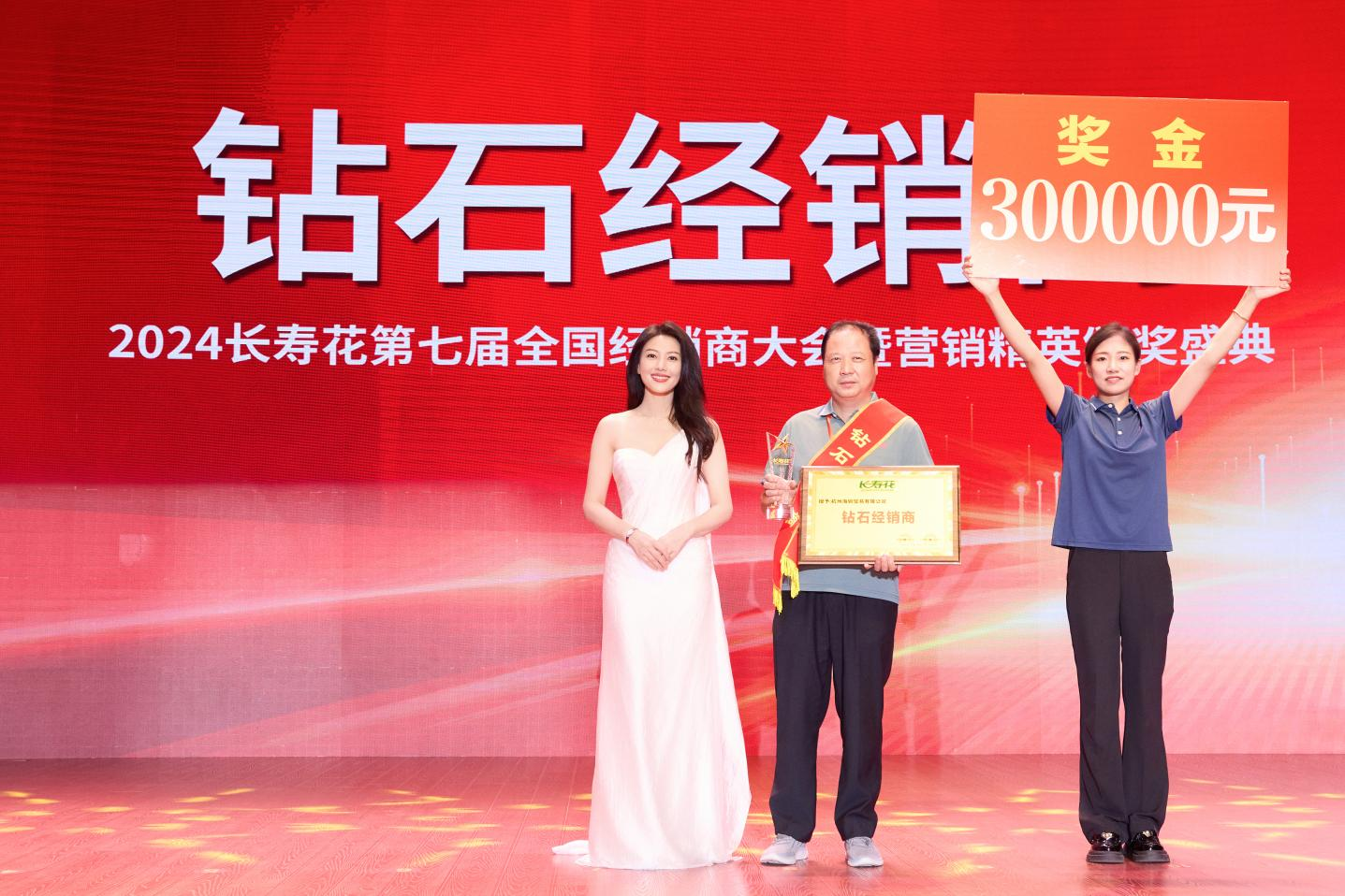頒獎(jiǎng)盛典上,長(zhǎng)壽花食用油代言人高圓圓為金牌經(jīng)銷(xiāo)商和鉆石經(jīng)銷(xiāo)商頒獎(jiǎng),并現(xiàn)場(chǎng)溫馨互動(dòng)。