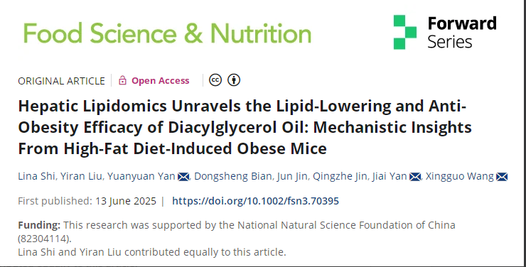 近日,國際權威學術期刊《Food Science & Nutrition》正式刊發(fā)了來自江南大學的團隊對甘油二酯食用油調控肥胖人群健康功效題為:Hepatic Lipidomics Unravels the Lipid-Lowering and Anti-Obesity Efficacy of Diacylglycerol Oil: Mechanistic Insights From High-Fat Diet-Induced Obese Mice”的最新研究成果。