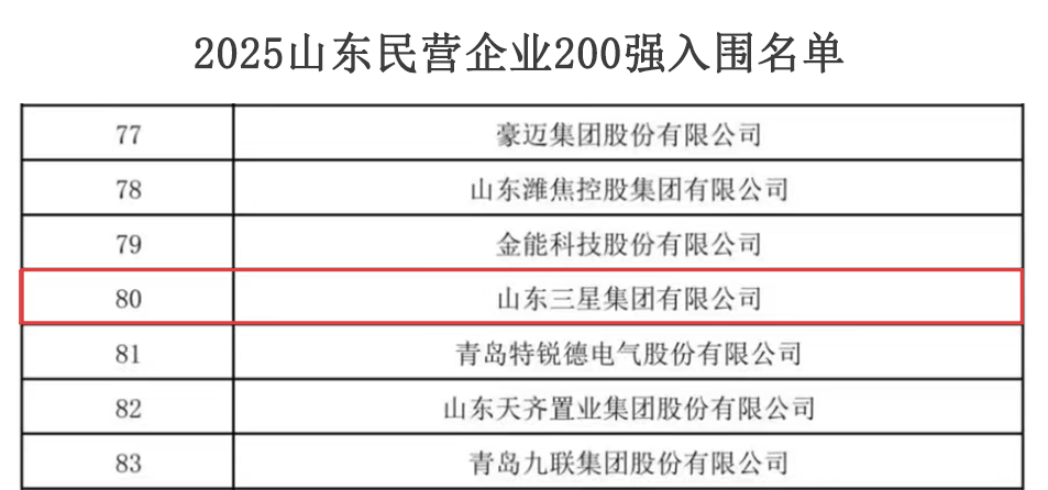 近日,山東省工商聯(lián)發(fā)布2025山東民營企業(yè)百強系列榜單入圍名單,山東三星集團上榜山東民營企業(yè)200強,位列第80位,較去年位次提升12位。集團旗下長壽花食品、裕航合金公司同時上榜山東民營企業(yè)創(chuàng)新100強,連續(xù)上榜民企百強榜單彰顯了企業(yè)在綜合實力、科創(chuàng)能力及發(fā)展?jié)摿Φ确矫娴膹妱彭g性和勢頭。