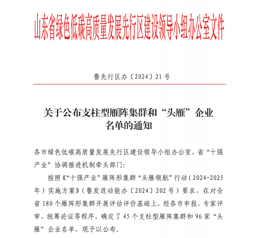 據了解,按照《“十強產業(yè)”雁陣形集群“頭雁領航”行動(2024—2025年)實施方案》要求,在對全省180個雁陣形集群開展評估評價基礎上,經各市申報、專家評審、統籌論證等程序,確定了45個支柱型雁陣集群和96家“頭雁”企業(yè)名單。