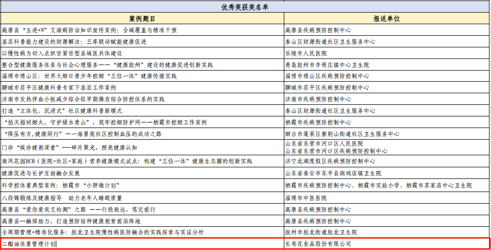 8月2日,第二屆山東省健康促進(jìn)大會在淄博召開。會上,長壽花食品《二酯油體重管理計劃》案例,憑借其突出的創(chuàng)新性與實效性,榮獲健康促進(jìn)優(yōu)秀實踐案例。