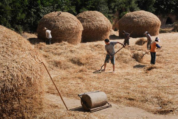 太陽剛露頭,打麥便開始了。將麥捆解開,均勻地鋪在場上,足有半尺厚。而后套上牲口,拉著石磙在麥子上轉(zhuǎn)圈。石磙“吱呀吱呀”地響,麥粒便從穗中脫落下來。孩子們最喜此時(shí),光著腳丫在麥秸上奔跑嬉鬧,任憑麥芒扎得腳底板發(fā)癢,也不在乎。